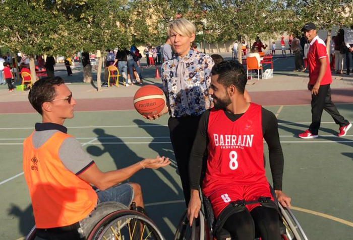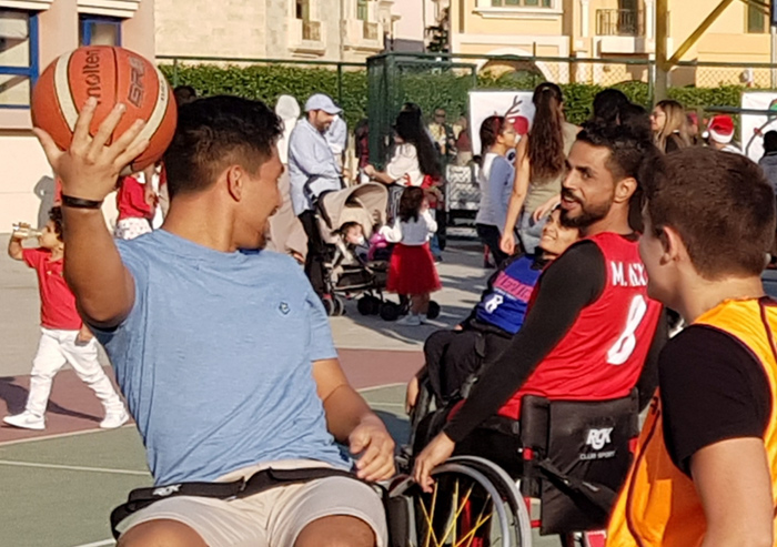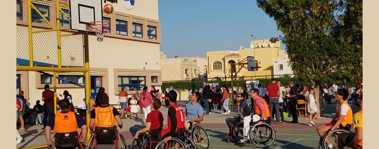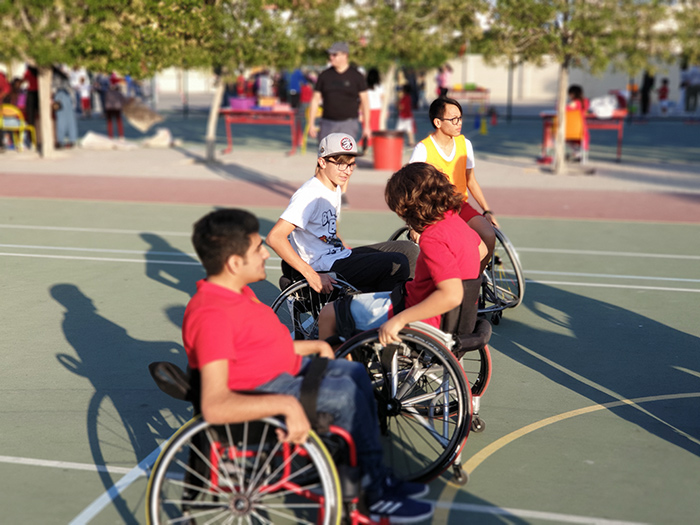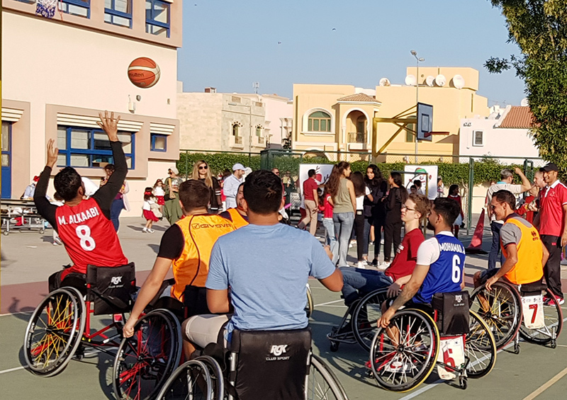 Sous l’égide de la fédération nationale handisport de Bahreïn avec laquelle un contrat de partenariat est en cours d’élaboration, des athlètes handicapés de haut niveau ont initié les élèves et les personnels au rudiment de l’utilisation d’un fauteuil roulant pendant une rencontre sportive.