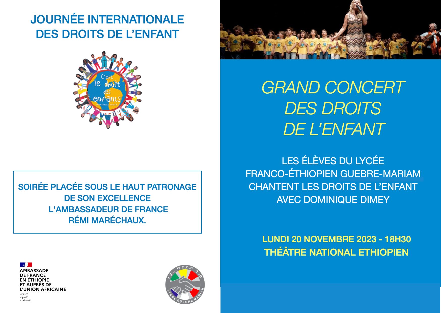 Le 20 novembre, le Lycée franco-éthiopien Guébré-Mariam d’Addis Abeba, en Ethiopie, a organisé un concert avec la participation de 144 de élèves de différentes niveaux qui ont chanté pour les droits des enfants. Ce projet émane d’une initiative de la chanteuse française Dominique Dimey, la messagère du droit des enfants pour Unicef France.