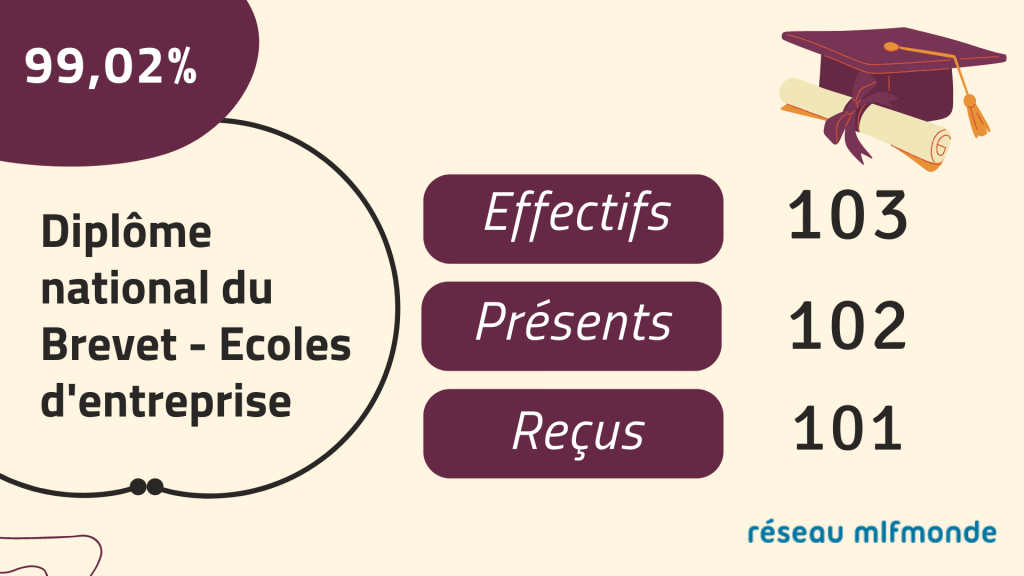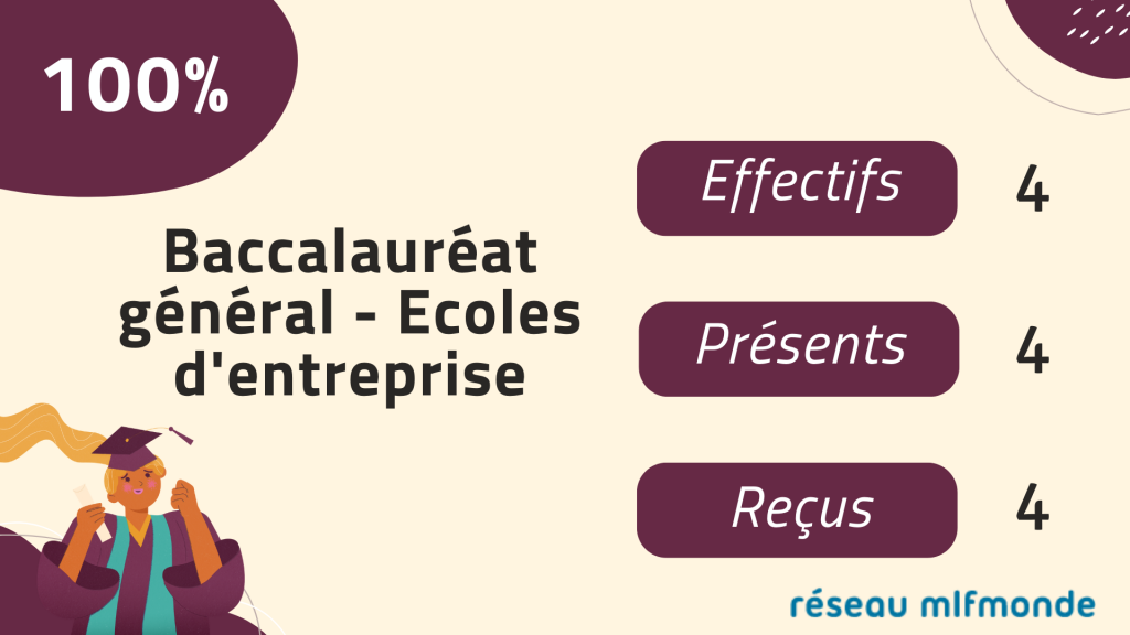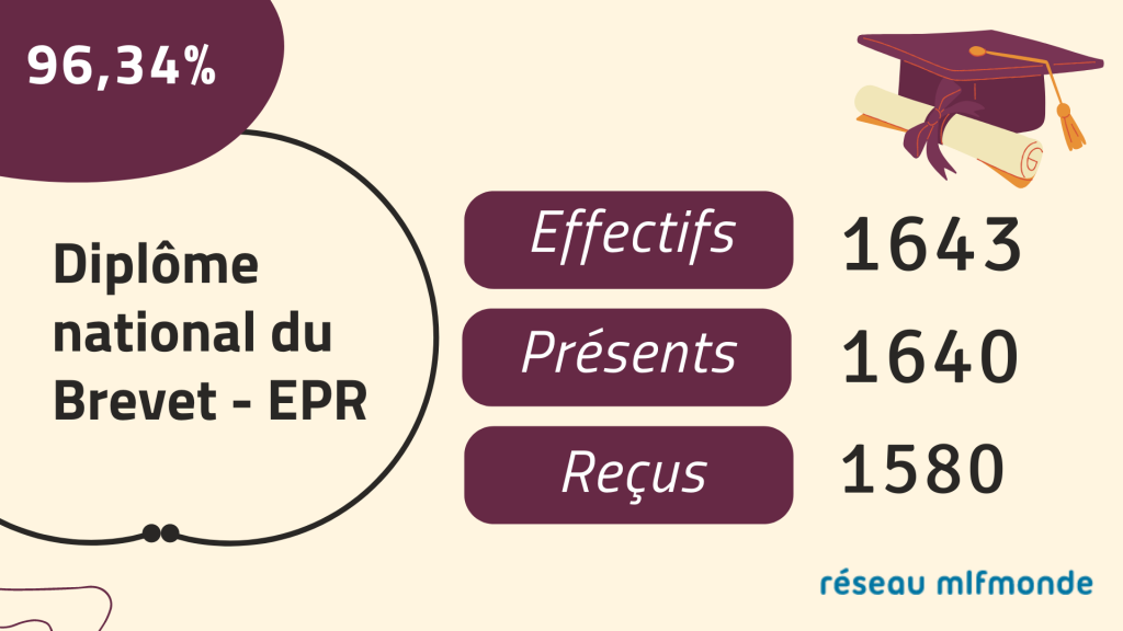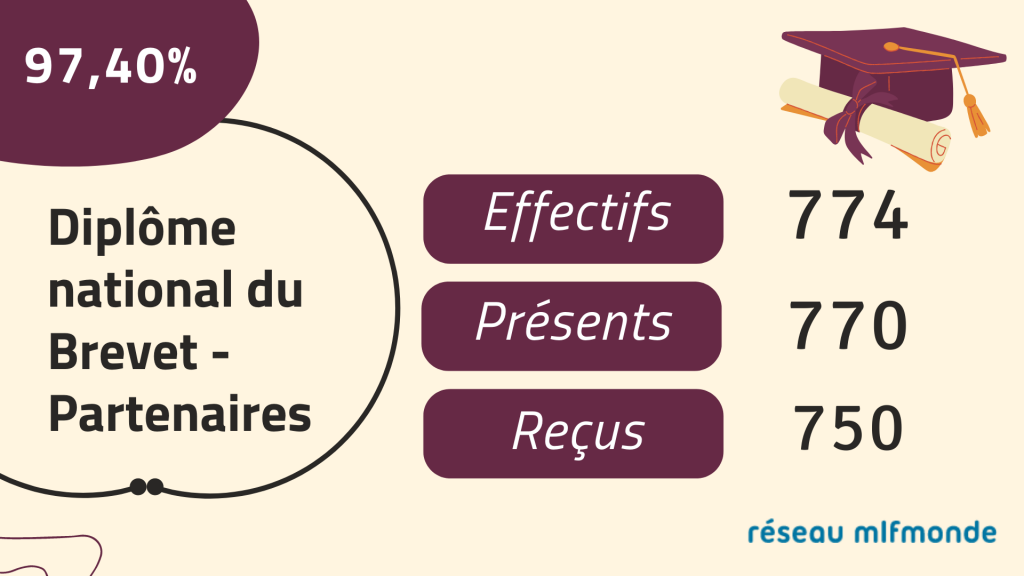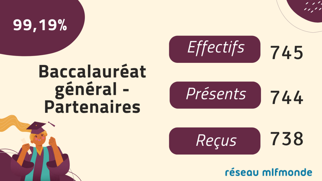 En cette fin d'année scolaire, les résultats aux différents examens sont à nouveau excellents dans les établissements du réseau mlfmonde ! Ils sont la preuve du dynamisme et du professionnalisme des équipes éducatives des divers établissements. Découvrez les résultats du Bac et du DNB 2021/2022.