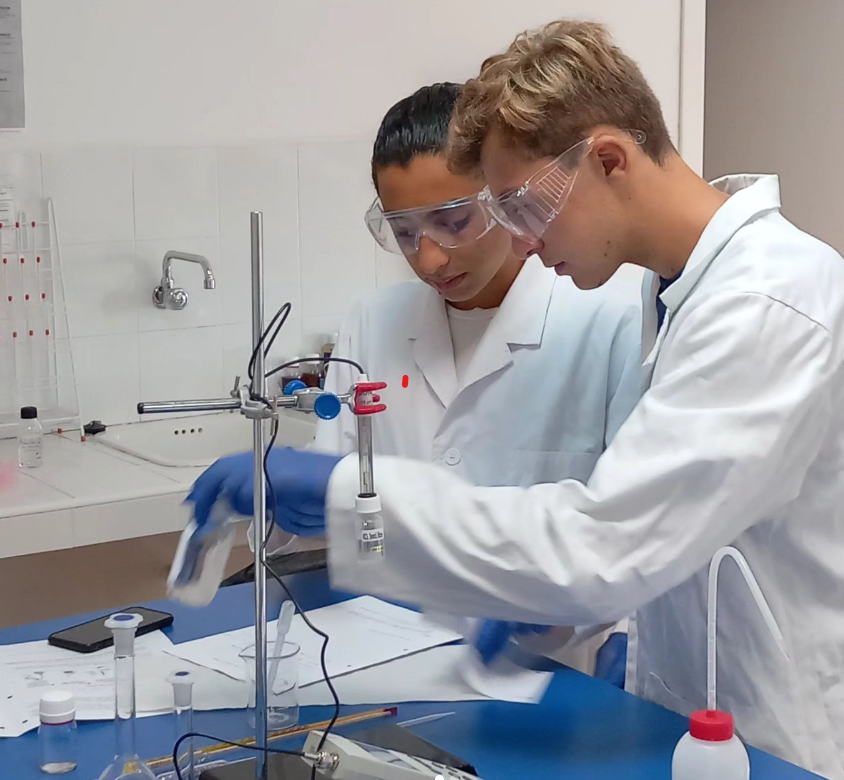 Nos élèves en physique et chimie travaillent dans le cadre d’une séance de travaux pratiques pour relier le niveau d’acidité mesuré par un pH-mètre et la concentration d’ions hydronium calculée par eux.