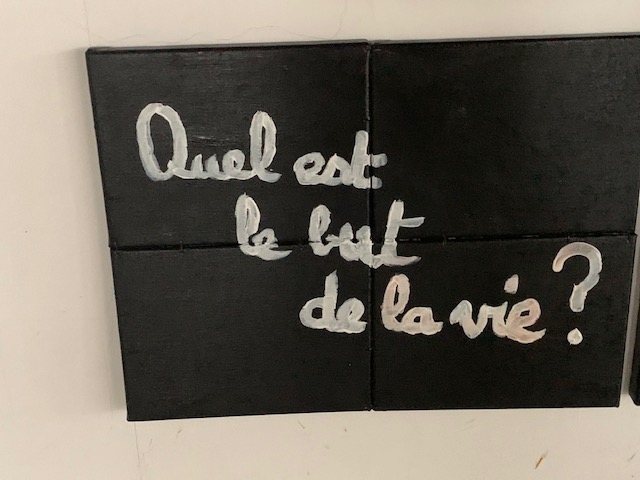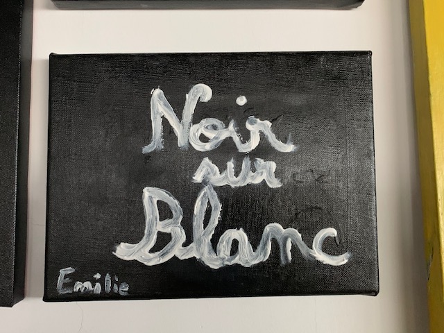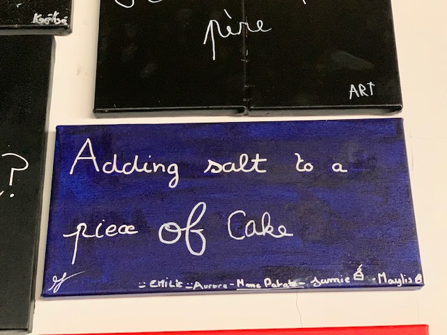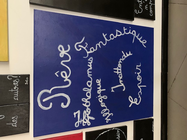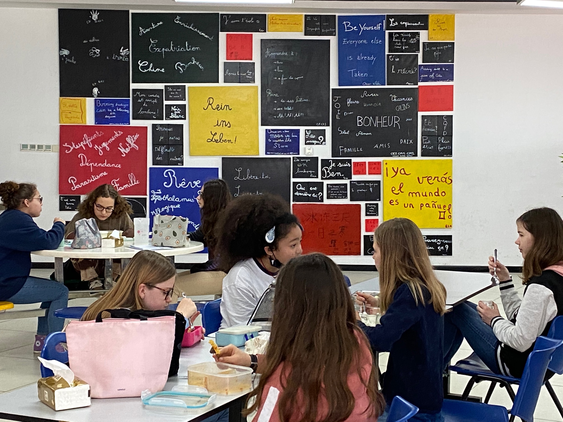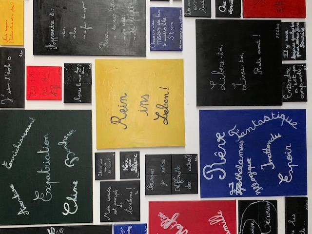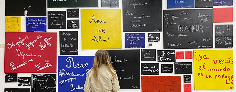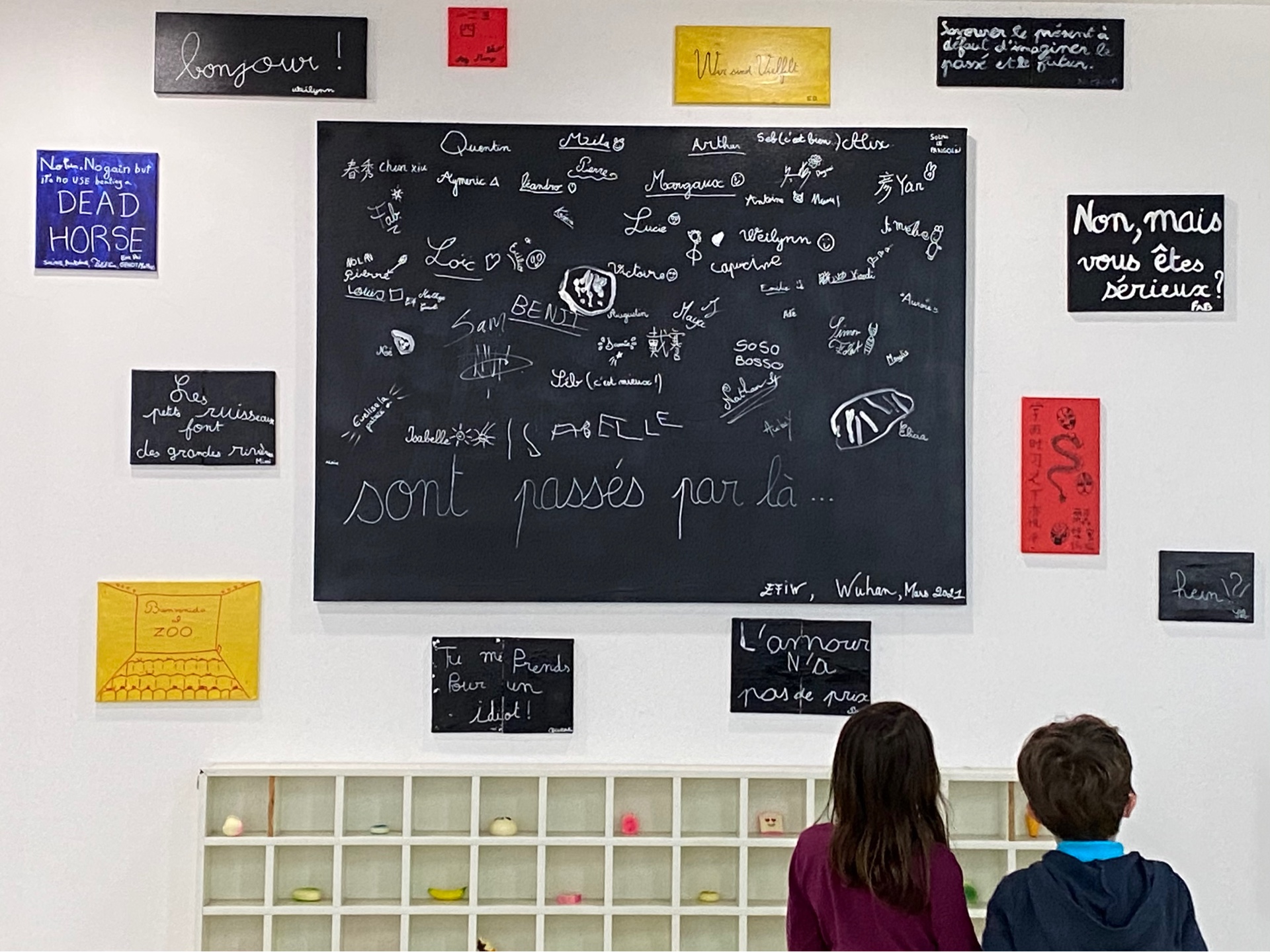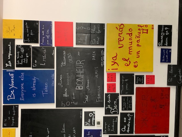 Après avoir étudié les réalisations de l’artiste, sa réflexion, sa philosophie et sa « patte artistique », les élèves ont réfléchi aux thèmes qu’ils aborderaient dans leur production plastique. Deux pistes artistiques : écrire librement des phrases sur le sens de la vie, le monde et ses corollaires ou bien trouver des synonymes/antonymes à un mot déclencheur (ex : le bonheur : amour, famille, vacances…). Chaque niveau, de la très petite section de maternelle à la classe de première, a contribué à sa manière à cette œuvre collective. Les différents tableaux de différents formats se déclinent en cinq langues : français, chinois, allemand, espagnol et anglais. Ils décorent aujourd’hui les murs du réfectoire de l’école. Chaque matin, les élèves s’extasient devant leur travail et réalisent qu’ils ont, à leur manière, écrit sur les murs.