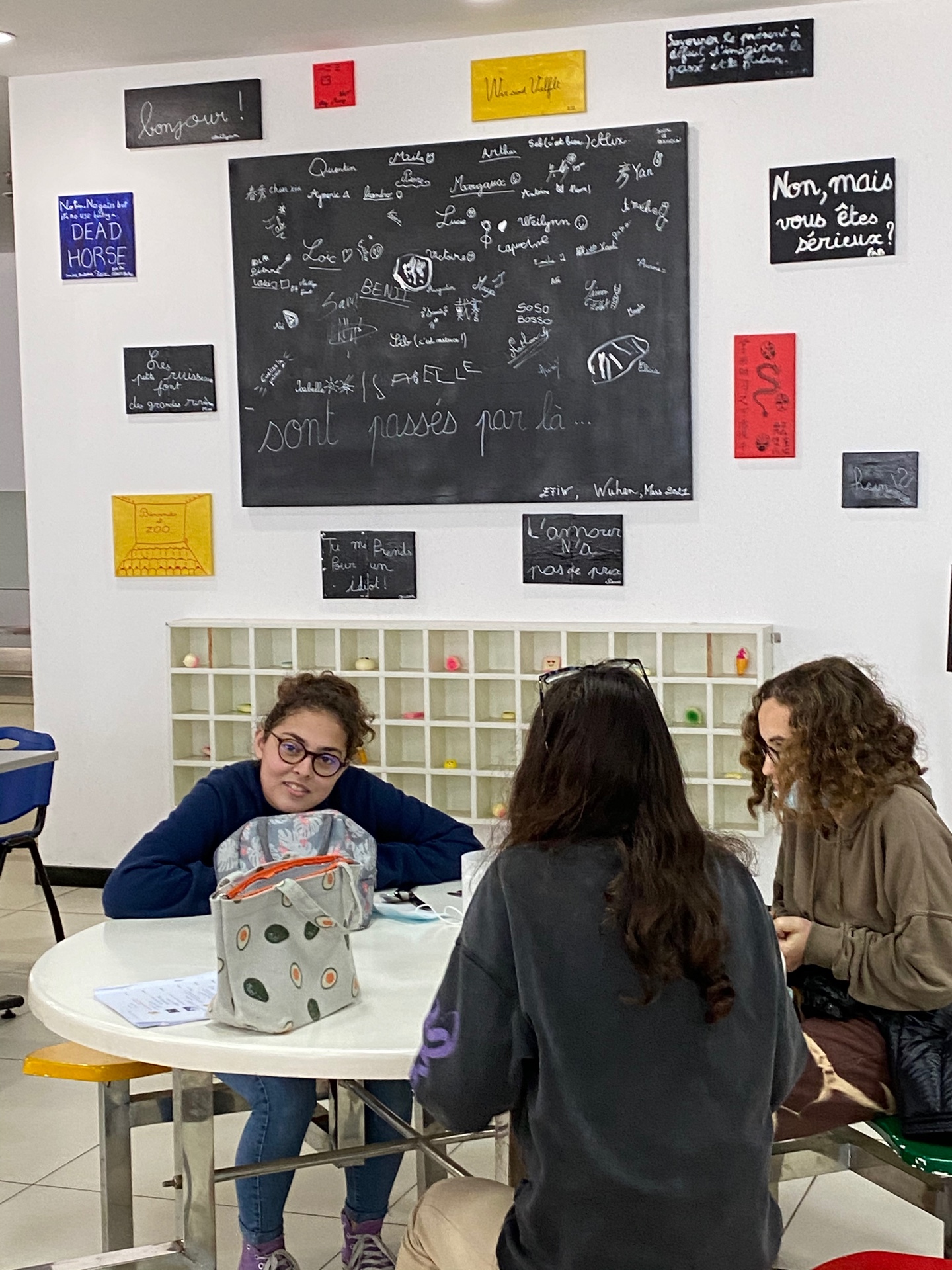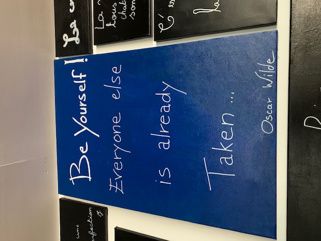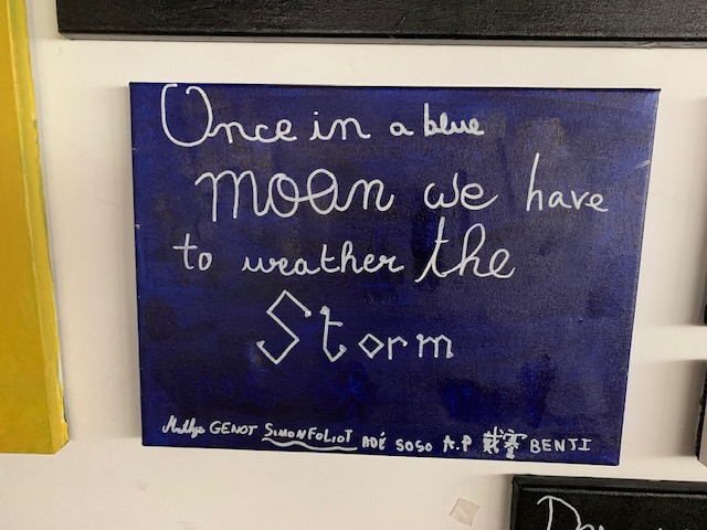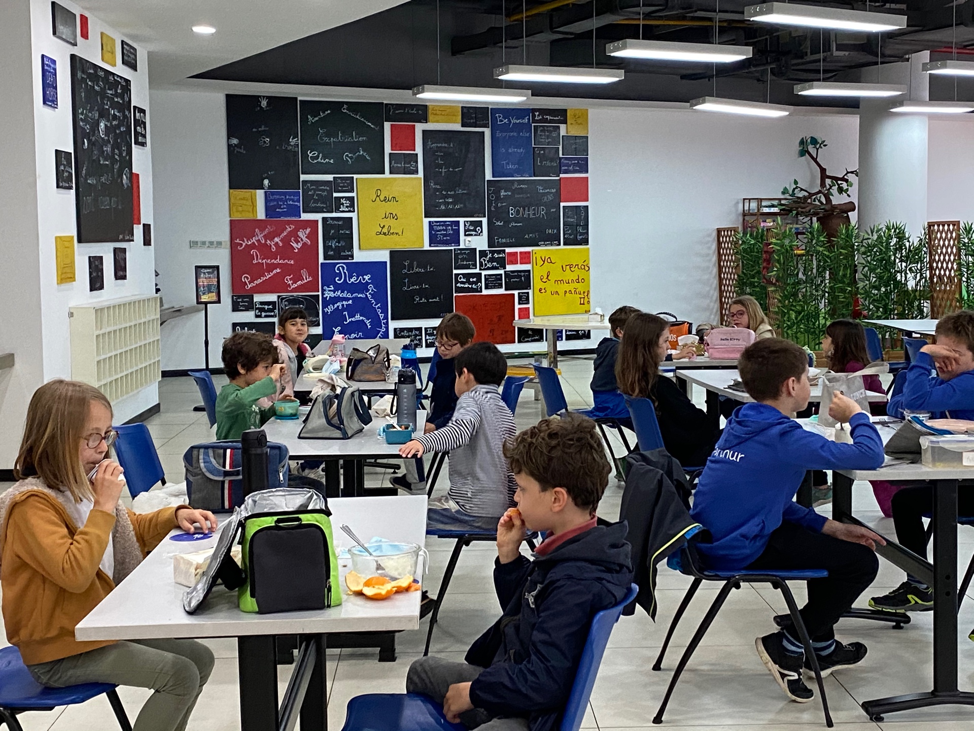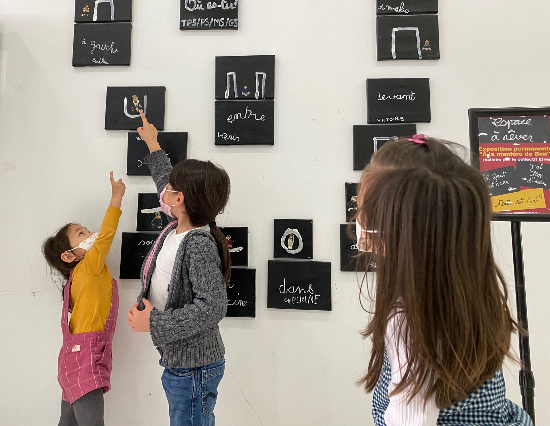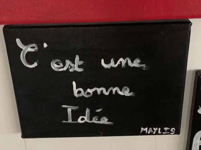 Après avoir étudié les réalisations de l’artiste, sa réflexion, sa philosophie et sa « patte artistique », les élèves ont réfléchi aux thèmes qu’ils aborderaient dans leur production plastique. Deux pistes artistiques : écrire librement des phrases sur le sens de la vie, le monde et ses corollaires ou bien trouver des synonymes/antonymes à un mot déclencheur (ex : le bonheur : amour, famille, vacances…). Chaque niveau, de la très petite section de maternelle à la classe de première, a contribué à sa manière à cette œuvre collective. Les différents tableaux de différents formats se déclinent en cinq langues : français, chinois, allemand, espagnol et anglais. Ils décorent aujourd’hui les murs du réfectoire de l’école. Chaque matin, les élèves s’extasient devant leur travail et réalisent qu’ils ont, à leur manière, écrit sur les murs.