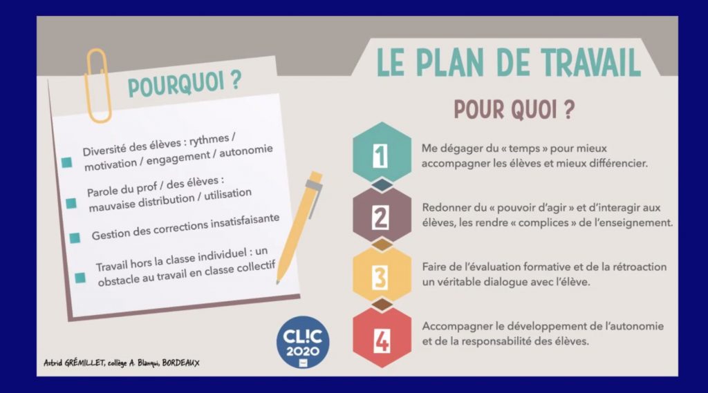 Le plan de travail : c’est « la pièce à conviction des pédagogies actives » dit Marcel Lebrun lors du #CLIC2020 (retrouvez ici la présentation générale). Sur éduscol, 40 exemples de plan de travail dans différentes disciplines. Ce plan de travail apporte des éléments de solution pour mettre en œuvre la différenciation, le travail sur l’autonomie et l’autoévaluation.