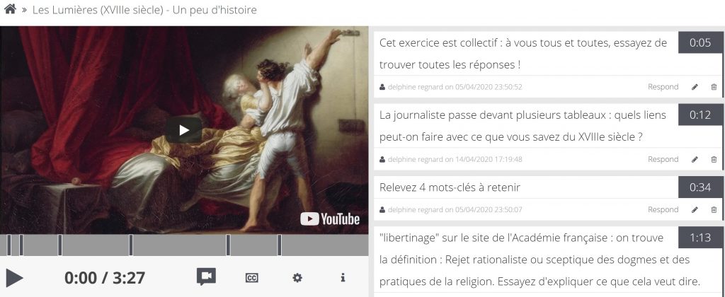 construire des capsules vidéos interactives aident l’enseignant.e à scénariser sa séance de façon à impliquer les élèves. Dans l’exemple ci-dessous réalisé avec vidéoant, on peut voir que le questionnement proposé permet de faire travailler les élèves en groupe : ils doivent collectivement réfléchir à apporter les éléments de réponse demandés.