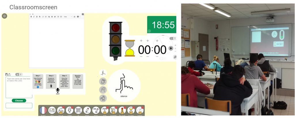 scénariser sa séance et soutenir son discours avec un outil comme classroomscreen (projetable en classe ou en visio) : des outils d’insertion d’images, de minuteur, de feu tricolore pour donner la parole, etc aideront chaque élève à se repérer et s’organiser.