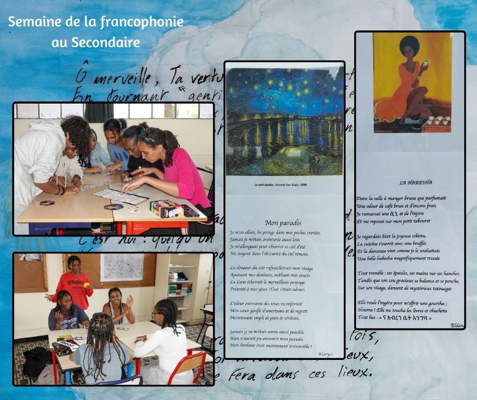 Du coté des collégiens et lycéens, les élèves organisent une exposition sur des femmes francophones ayant marqué l’histoire et poursuivront un quiz en lien avec l’exposition. Des activités ludiques mises en place autour d’expressions françaises, mais aussi de jeux basés sur l’étymologie des mots. Enfin, les élèves participeront à un atelier d’écriture créative reprenant le concept de « Dis-moi dix mots ».