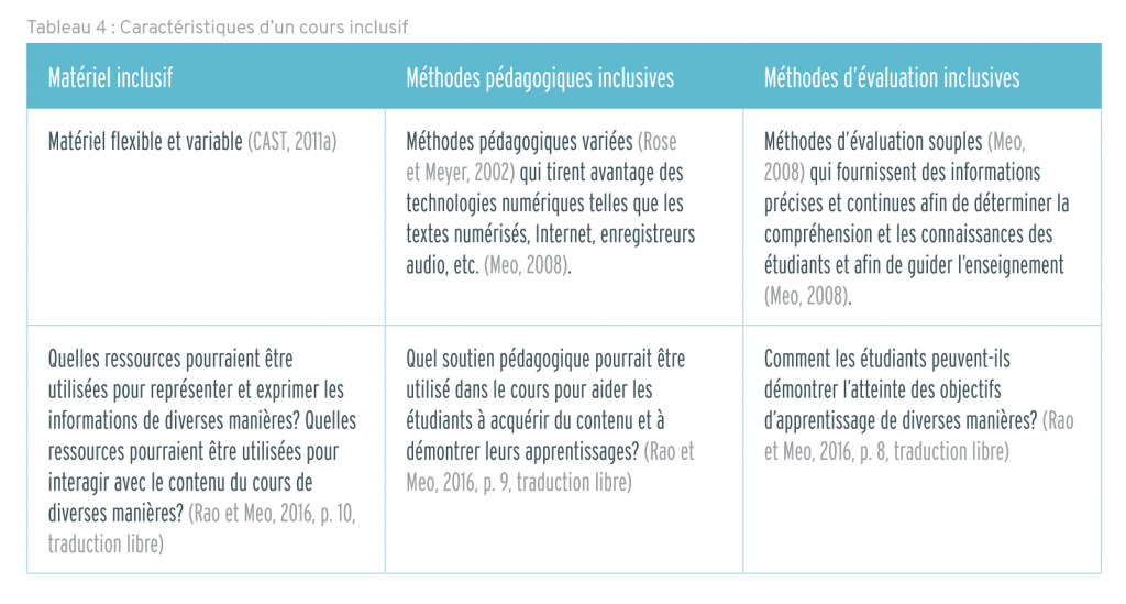 • La pédagogie inclusive vise le développement du plein potentiel de tous les étudiants (Bergeron, Rousseau et Leclerc, 2011). Elle postule qu’il n’existe pas d’apprenant typique et que la diversité est la norme (Meyer, Rose et Gordon, 2014). D’emblée, l’approche inclusive reconnaît donc la variété des besoins d’apprentissages selon les individus. Cette approche reconnaît également que chez un même individu, les besoins d’apprentissage fluctuent dans le temps et dépendent des contextes.