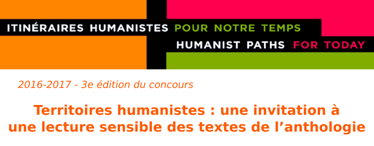 Après avoir « dit le monde » puis avoir interrogé les valeurs humanistes et, à travers elles, le citoyen, la thématique de la troisième édition du concours Itinéraires humanistes était « Territoires humanistes : une invitation à une lecture sensible des textes de l’anthologie ». Le palmarès a été annoncé au congrès Mlf/OSUI à New-York le 11 avril :