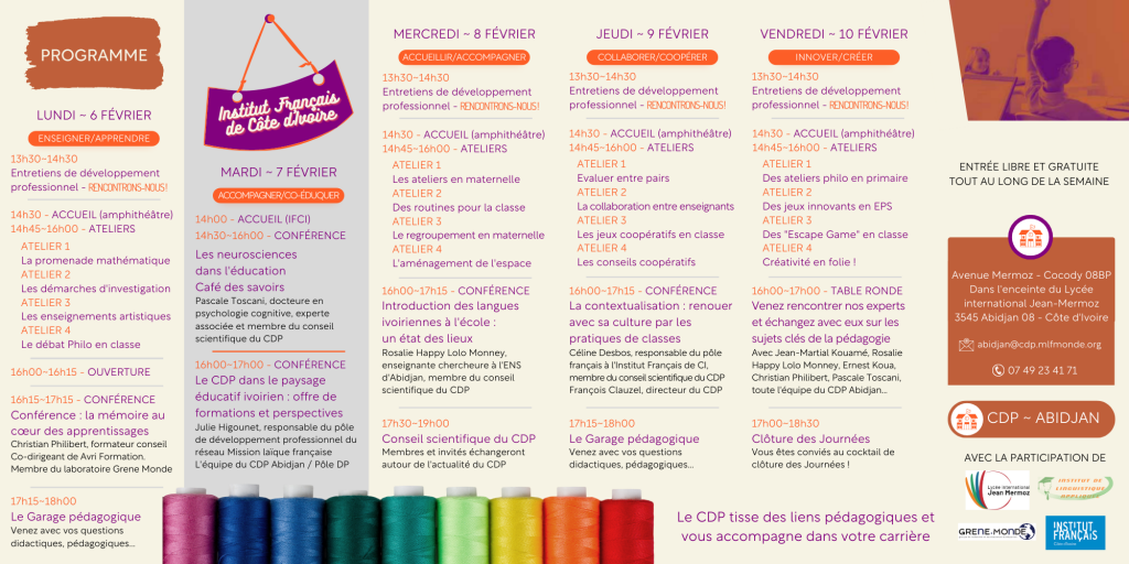 Cette année, les journées du CDP d’Abidjan se tiendront du 6 au 10 février prochain dans l’enceinte dulycée international Jean-Mermoz. Elles sont destinées à tout enseignant confirmé ou en devenir, exerçant dans le public ou dans le privé, personnel d’encadrement, chef d’établissement, ONG, entrepreneur en éducation, étudiant. L’entrée est libre et gratuite.