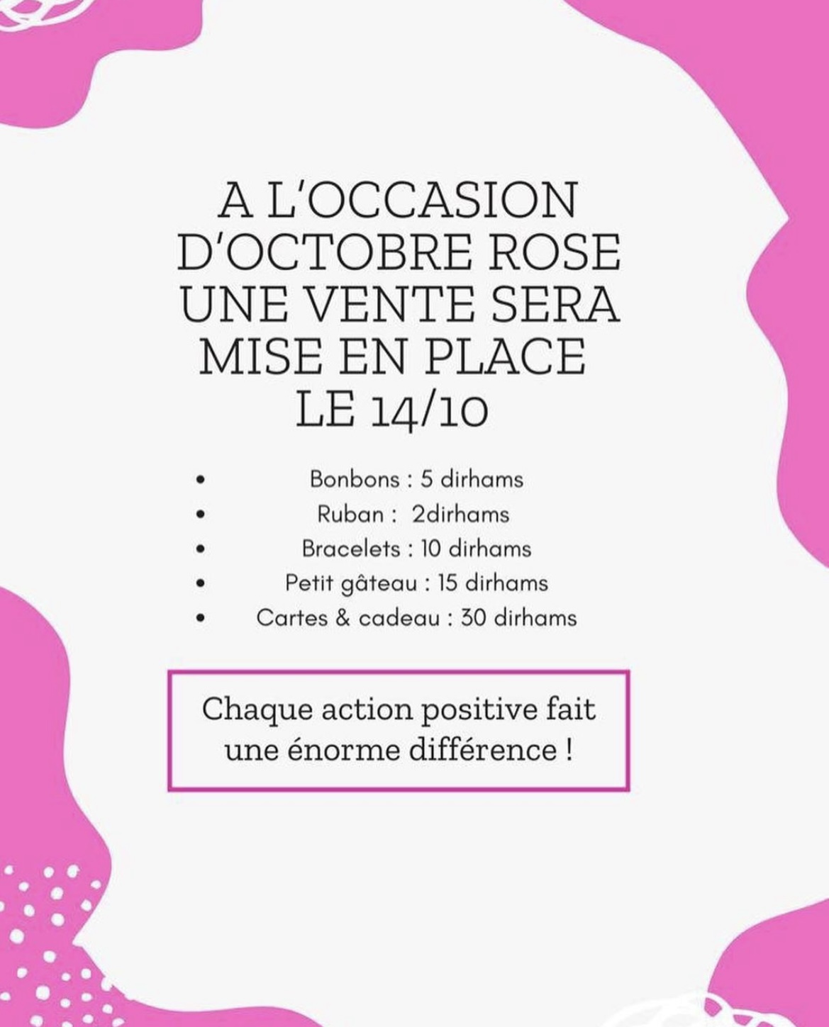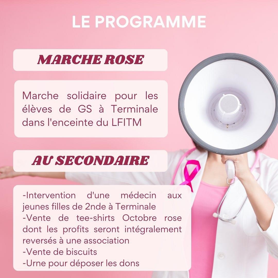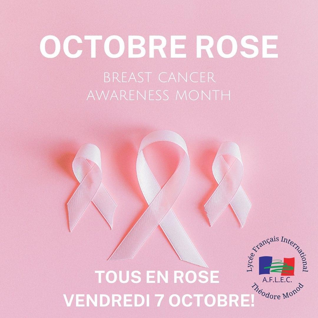 Les élèves de la classe de MSC du Lycée français international Théodore Monod ont aussi soutenu Octobre Rose en réalisant leurs empreintes de mains avec de la peinture rose. Une marche rose solidaire a été organisée pour les élèves de GS à la Tle dans l’enceinte de l’établissement suivie d’une sensibilisation pour les 2nde-Tle. Des ventes de tee-shirts et de biscuits ont été réalisé et les profits obtenus versés intégralement à une association de lutte contre le cancer du sein.
