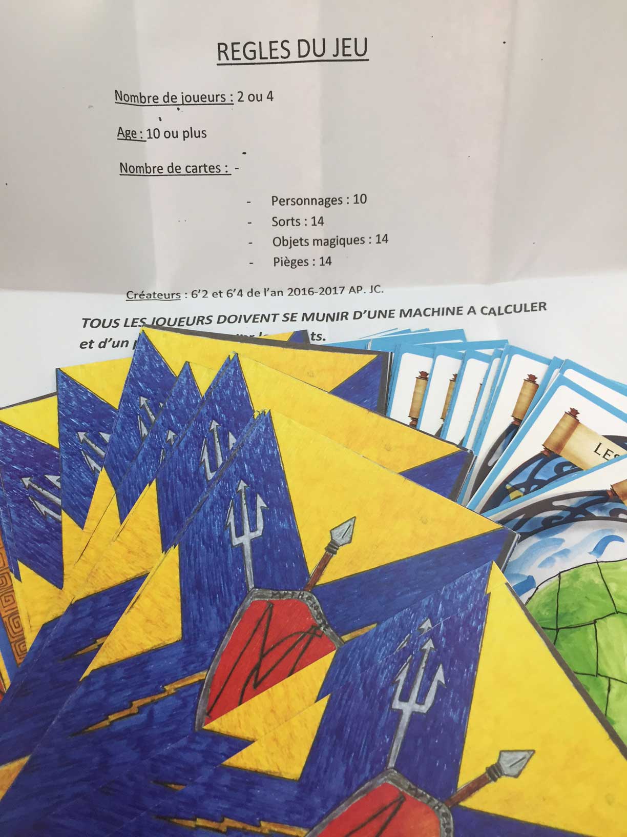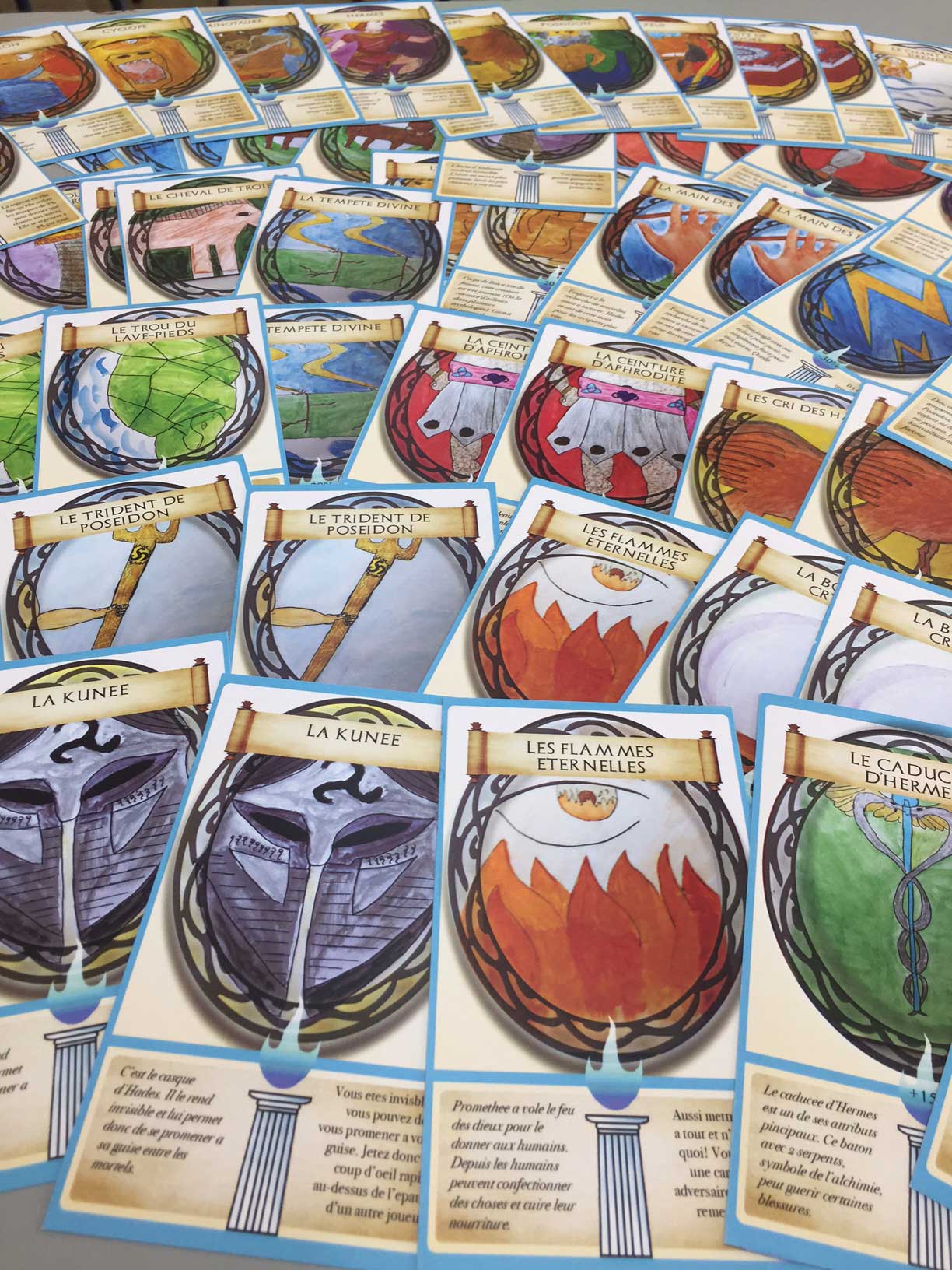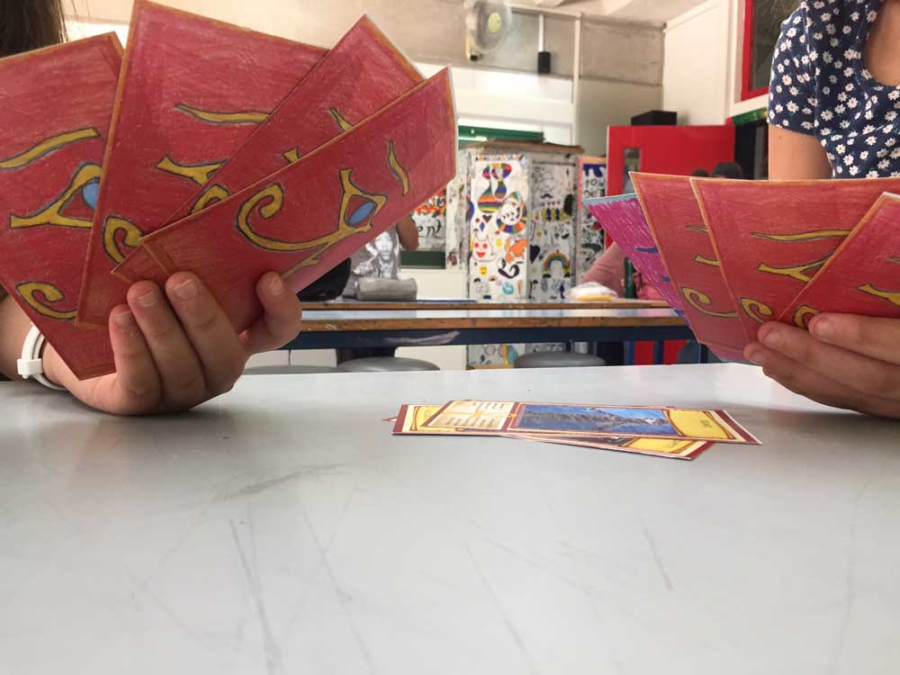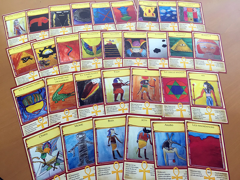En arts plastiques l’an dernier, les classes de 6e ont réfléchi à la question de l’interdisciplinarité. Un terme bien compliqué que les enfants ont su traduire en langage « élève » : un jeu de rôle ! Ainsi sont nés quatre jeux de 52 cartes où il faut connaître la mythologie, tout en calculant les points que la foudre de Zeus ou la Momie enlèvent au personnage en utilisant des pourcentages.